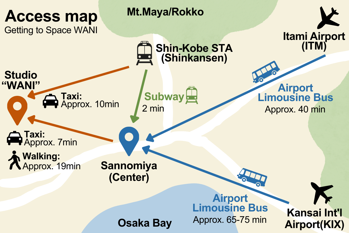 - From Shinkansen (Shin-Kobe Station): Take the Subway (1 stop) to “Sannomiya Station” (2 min / 210 JPY) or a Taxi directly to our studio (10 min / approx. 1,500 JPY).