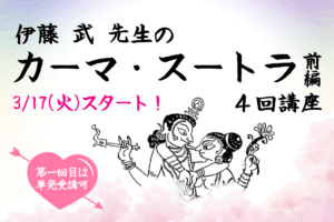 2026/3/17(火) start 【第1回は単発受講OK】伊藤武先生のカーマ・スートラ4回講座〜前編 講座の雰囲気を見てから、継続するか検討したい方のために、第1回のみ、単発受講が可能です! 伊藤武先生の「カーマ・スートラ講座」を開催します。前編と後編に分けまして、まず前半は4回で開催します。 当初はヨーガ・スートラ講座…